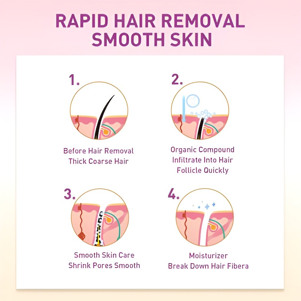 It can remove hair gently, inhibit and delay hair growth, does not damage the skin, softens the hair, moisturizes the skin, and removes the hair painlessly without leaving black spots.