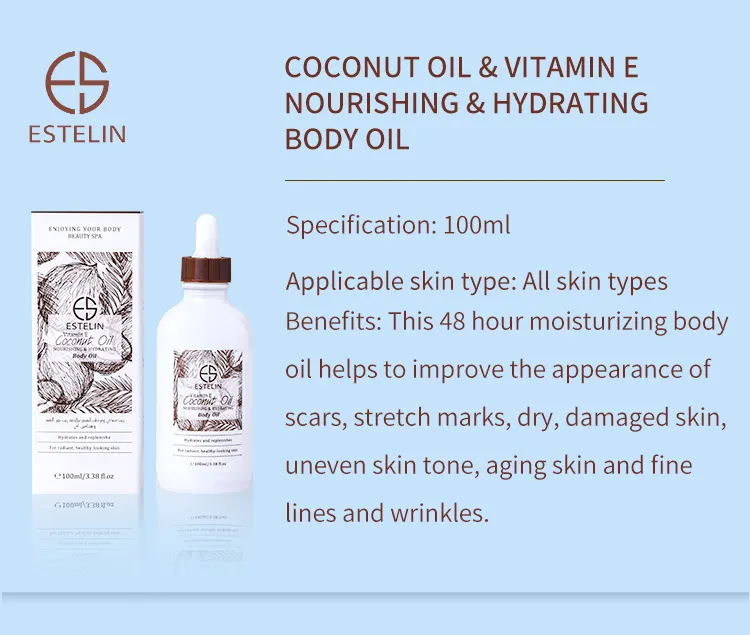 Benefits: Our coconut oil with vitamin E is a very light-weight and super absorbent multi-purpose oil This 48 hour moisturizing body oil helps to improve the appearance of scars, stretch marks, dry, damaged skin, uneven skin tone, aging skin and fine lines and wrinkles