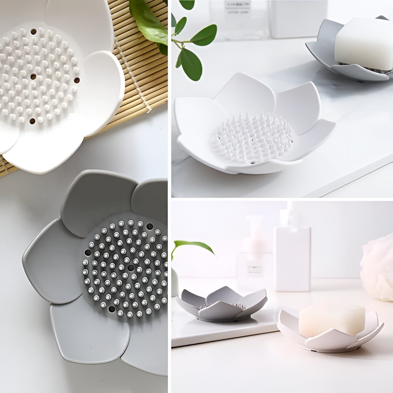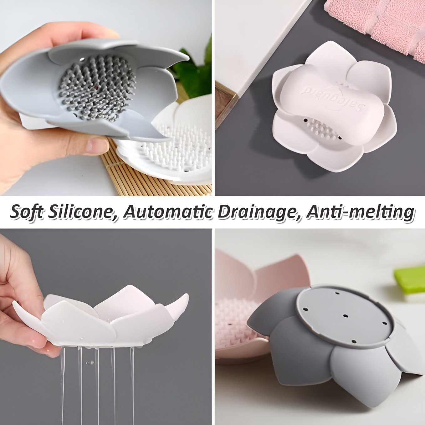 - Small Silicone Soap holder design to avoid the soap to touch water, while can effectively prevent soaps from melting and turning into pastes. 5 drainage holes at bottom draw excess water away from soap and keeps the soap tray clean & dry for a Long Time. The petal-shaped design prevents the soap from slipping off the soap tray.